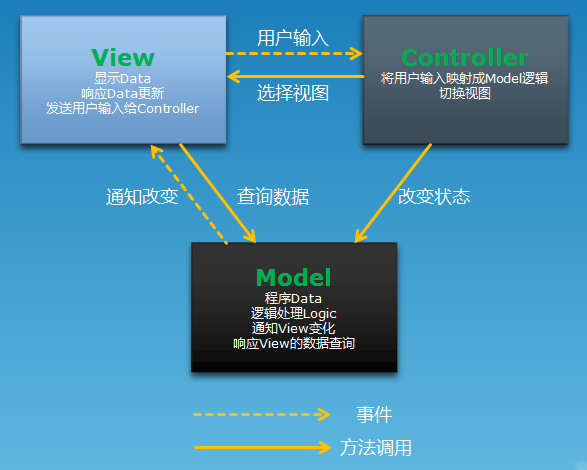 了解MVVM模式之前,我们先来简单了解一下从MVC到MVVM的变迁。这个变迁是耦合从紧到松的变迁,是对依赖处理的进化,是应对变化技术的成熟。