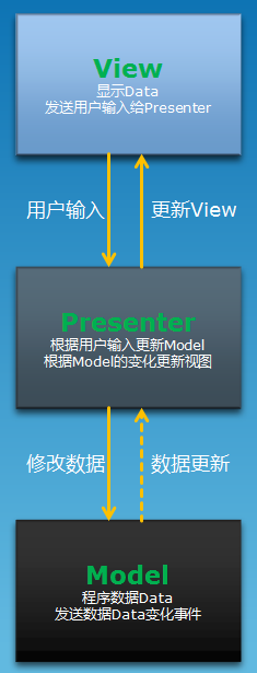 MVP的全称为Model-View-Presenter,Model提供数据,View负责显示,Presenter负责逻辑的处理。MVP与MVC有着一个重大的区别:在MVP中View并不直接使用Model,它们之间的通信是通过Presenter来进行的,所有的交互都发生在Presenter内部,而在MVC中View会直接从Model中读取数据而不是通过Controller。