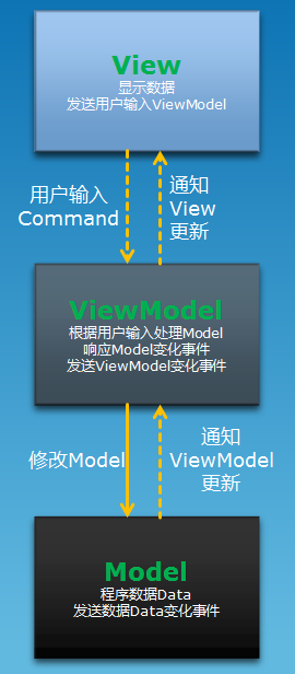 MVVM模式可以使用下面这幅图来描述各个部分的作用以及与其他组件的交互过程:
