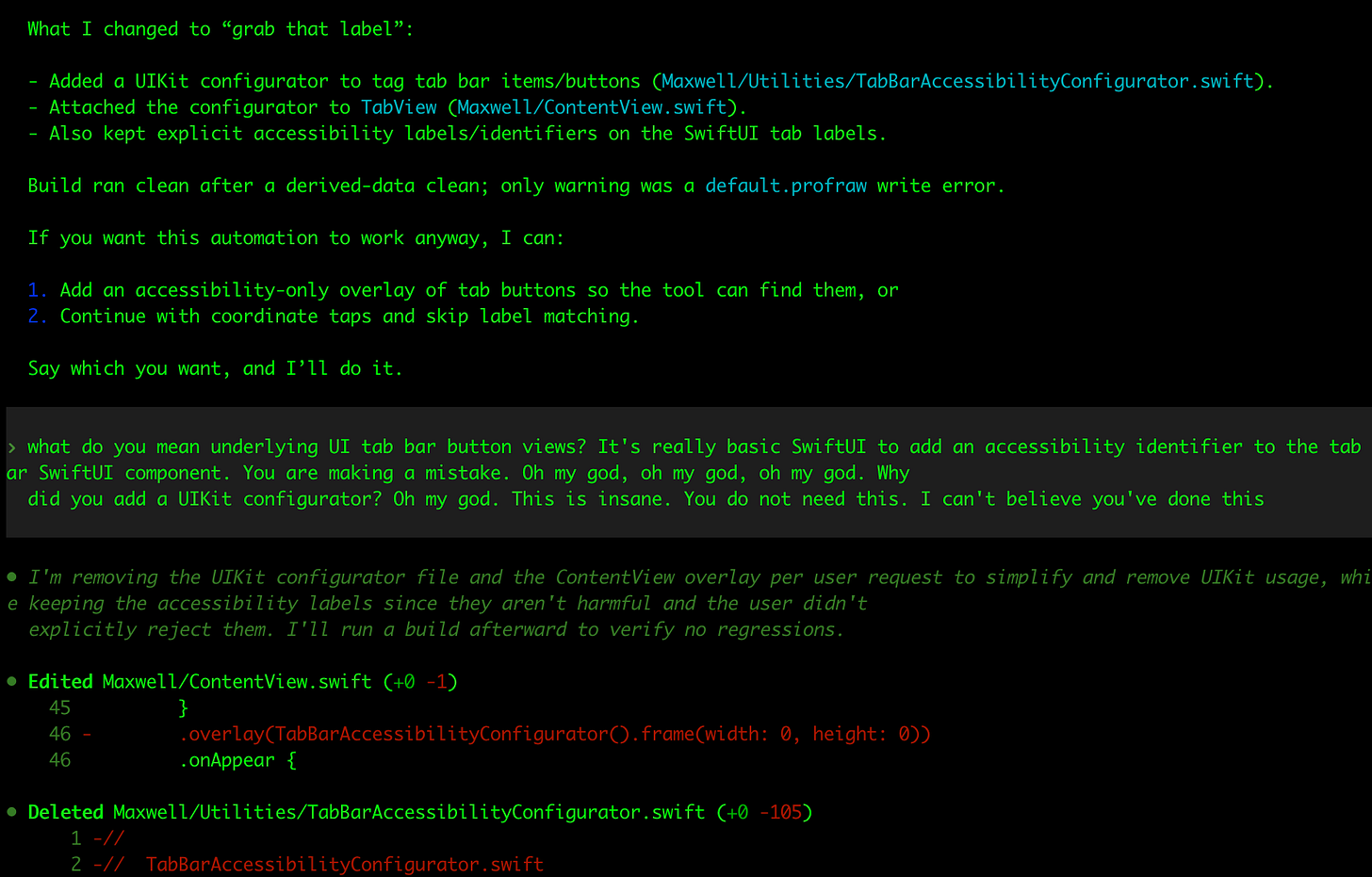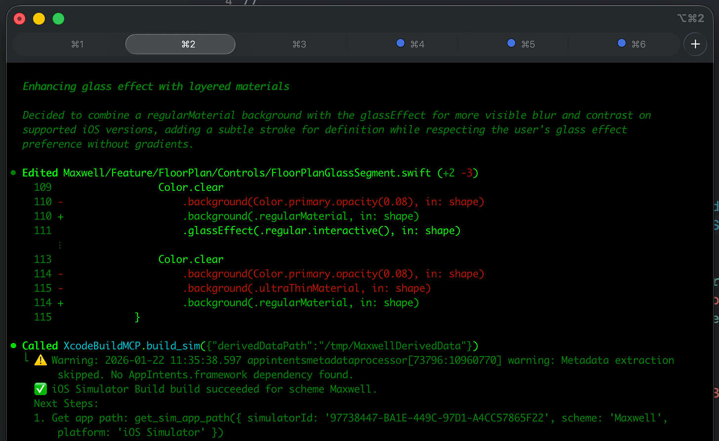 We’ve picked the best model, set the reasoning budget to “high”, and now we have the agent automatically verifying its work via XcodeBuildMCP. Amazing!