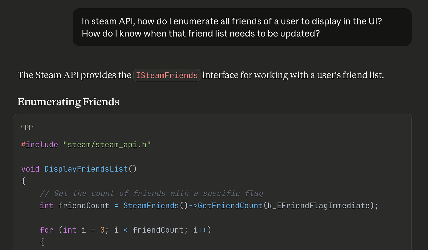I had a recent, quite eye-opening, Twitter exchange: someone claimed “AI is bad at programming”, then proved it by showing me a half-baked prompt in a web chat, asking about a Steam API, and getting a hallucinated response.