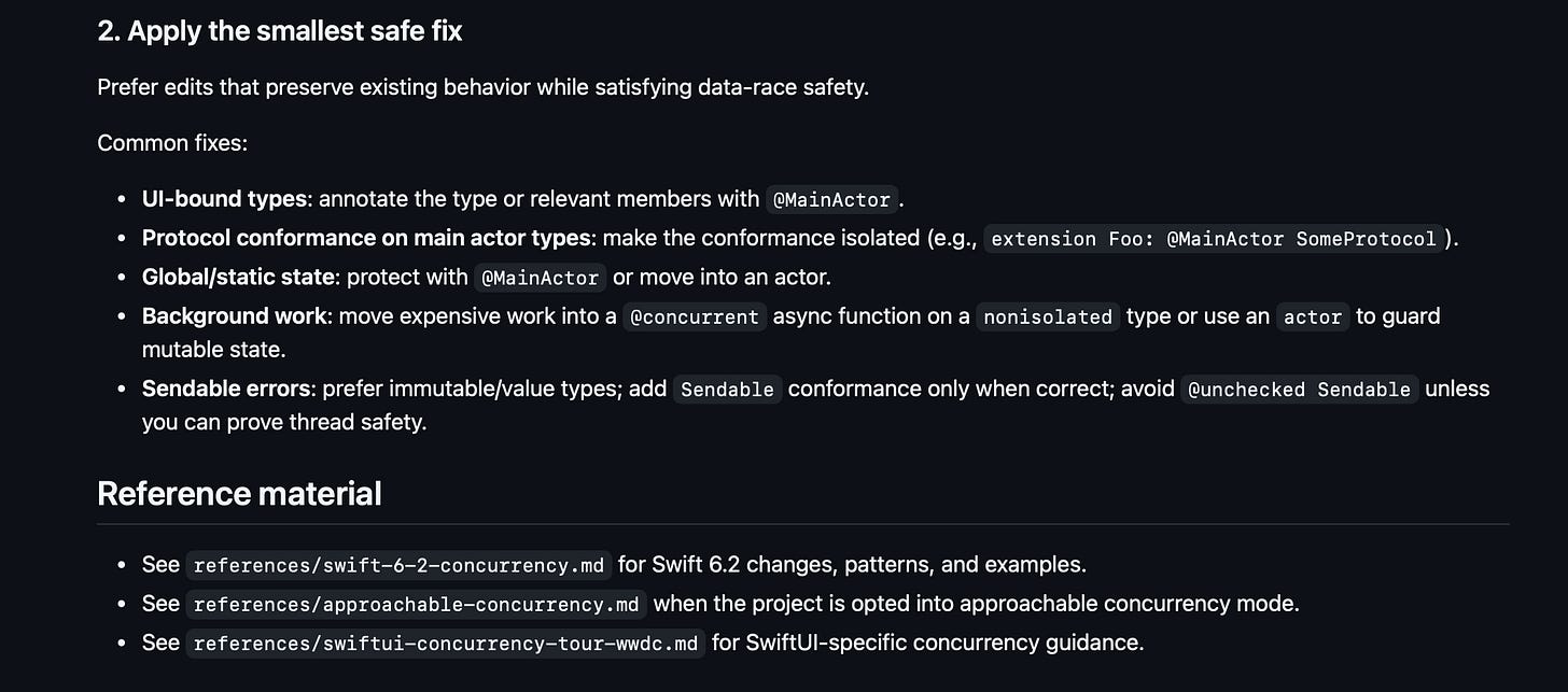 The repo contains some open-sourced AGENTS.md, slash commands, and skills for SwiftUI and concurrency review.