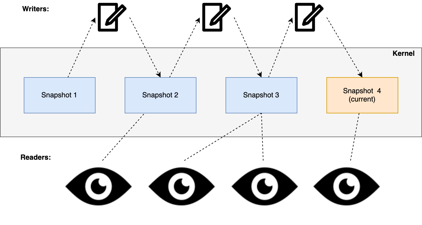 写入器排队创建新快照,但读取器永远不会被阻塞。 然而,它们可能会收到稍微过时的信息。