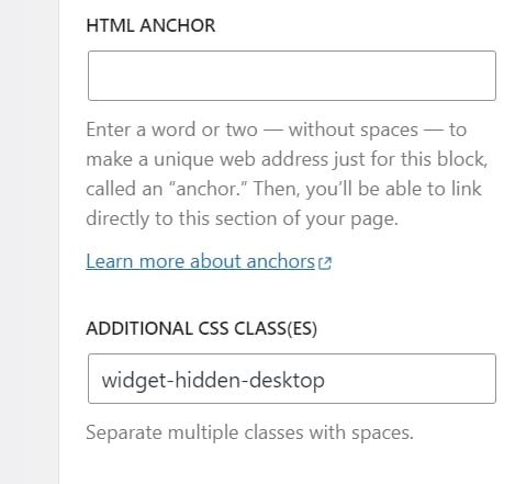 - Additional classes: To hide a block from your sidebar, add the class “widget-hidden-desktop” or “widget-hidden-mobile” to the block’s “Additional CSS class(es)” field.