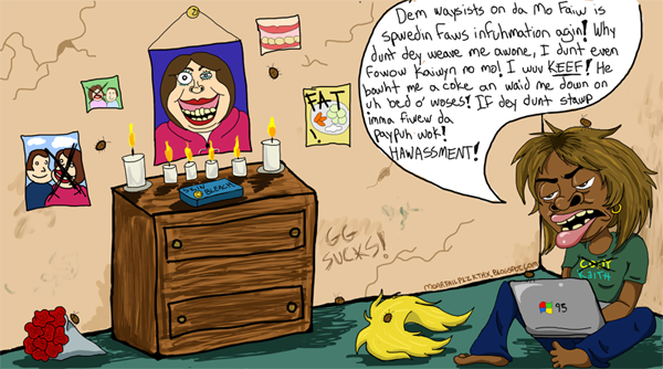 Mooren found forums and blogs online dedicated to trolling the FAS Kween and started posting dirt on them. At her stalking peak, Mooren showed up at Wal-Mart several times a week and finally filmed her encounter [3] with her ex, Matt. The crazy nignog has since slowed her antics, but continues to peruse the forums in order to keep up with her successor.