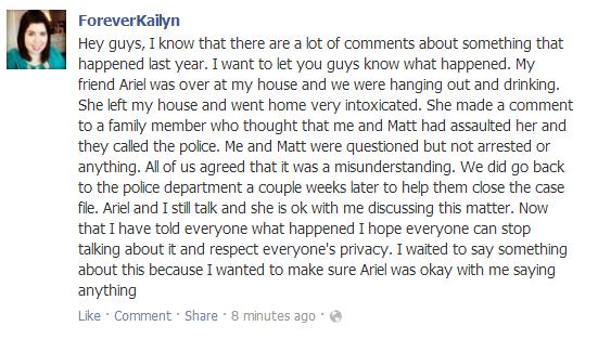 On October 2, 2013, well prior to their divorce, Kailyn and Matt sexually assaulted their friend A. In February, the scandal was announced to the PLs after a PL pretending to be a stan baited Kai for personal info. Kailyn brought up the assault herself, saying that A was "too drunk to chew her food", and that she and hubby were placed in separate police cars for questioning ("it was thcary!"). The accusations were confirmed online by Bowie police reporting a forcible rape call on Kailyn's block that particular night. The incident was again confirmed when Mama Wilcher (ghostwriting for Kailyn) wrote contradicting social media statuses on Kai's behalf saying it was all a "misunderstanding". After realizing she had managed to turn even the most politically correct, social justice communities against her, she deleted everything. In Kai's world, deleting = it never happened.