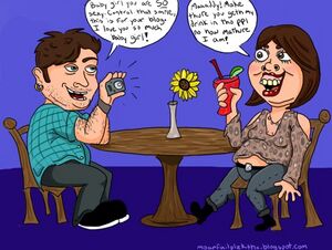 David (aka Davit) was Kai's first true love. They started dating when Kai was just a mouth full of teeth attached to a 15-year old potato head retarded thing. Davit is (was) a sickly fatass who liked to party, drink and dabble in drugs, and was the only person to ever introduce Kai to socialization. Early in their relationship, Kai and her mullet became pregnant with Avery Juan 1.0 but ended up aborting the demon at Davit and Mama Wilcher's demand. Throughout their 5 years together, Kai began her scandal timeline, including camming, shoving her saggy gorilla tits in his friends' faces, having a 3-some with Davit and his friend "hot dave", and targeting Craigslist for trannies and dykes to calm her retard-hypersexuality. But in the end, Kai's retard-hypersexuality and selfishness ruined their relationship. In 2011, Kai broke up with Davit on BlogTV to appease the trolls telling her to do it for the lulz, and soon after the relationship ended for good.