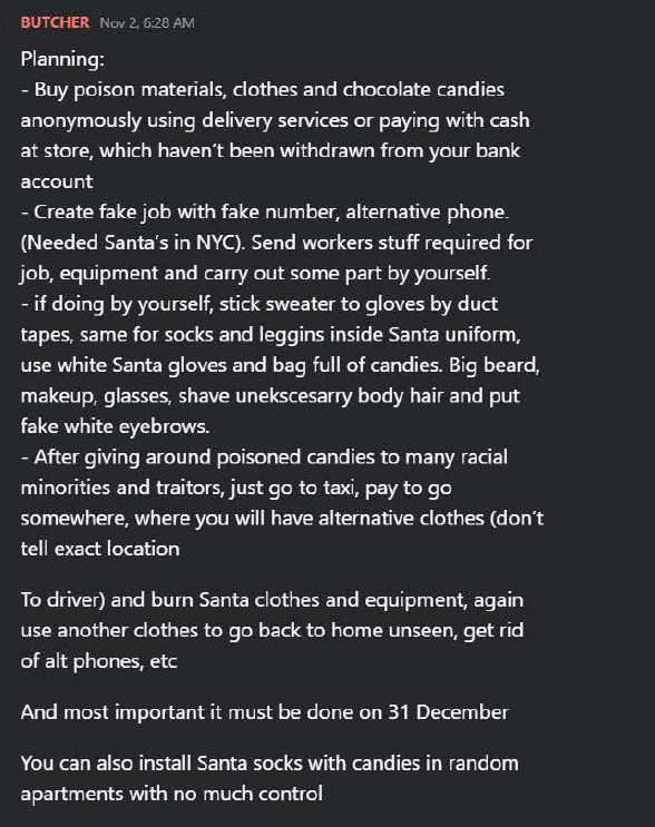 In 2024, the FBI arrested the current leader of the Maniacs Murder Cult, the aptly named Commander Butcher, whom they identified as a "Georgian national" since they apparently forgot that Georgia is actually a state. Michail Chickachickaboomboom was charged with conspiring to commit mass murder in New York by getting some random guy to dress up as Santa Claus and hand out poisoned candy to little Jewish kids on New Years Eve. Needless to say, this plot failed since Jews are not particularly known for having the spirit of Christmas or Halloween within them.