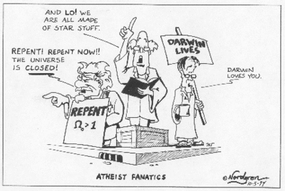 Dawkins claims that all religion is STUPID AND EVIL. God is a delusion, Christianity is just as dumb as Scientology, angels = Mooninites, et cetera. For this he is oft-labeled a Fundamentalist atheist and IRL troll. Nonetheless, his books are insanely successful, and his lectures are well-attended by smarmy 13-year old boys. Religious people, whom he calls "faith-heads," seem to be obsessed with putting him in intellectual checkmate, but it always winds up with both players just beating each other about the head with the chessboard. Dawkins produced a Michael Moore-style "documentary" called "[Religion:] The Root of all Evil?" Butthurt theologian Alister McGrath wrote two whole books, "Dawkins' God" and "The Dawkins Delusion," devoted to tearing him down; Dawkins is now working on "Alister McGrath: a Rapist?" and "Your Mom: a Dirty Whore?" in the tradition of respectful scholarly discourse.