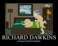Richard Dawkin's name happens to be an anagram for "Rah! Darwin's Dick!" (srsly). In case you have not noticed he has a raging hard-on for the world's most famous evolutionist and frequently uses his theory to prove that religion is wrong and science is truth.