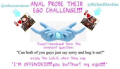 Since both Watson and Dawkins Godzillla-sized-ego's are only rivaled by their Supercunt & Superdick statuses it was a matter of time before trolls at DysfunctionalWatsonDawkins noticed that their "strength" was their weakness: Nothing butthurts an egomaniac more than saying sorry publicly. So the best way to butthurt their super inflated egos was by asking them to do something they would never do, something they would rather eat broken glass than actually doing, something fucking unthinkable even for their high intellects, something horrible such as, you know, saying sorry to one another. These are the instructions according to the site: