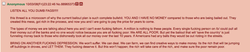 Others claimed that the bail-out shouldn't happen, either because they were all tweaked on paint fumes or because they felt that rewarding Wall Street's epic failure with free taxpayer moniez equates to a rough and tumble brand of Capitalism for the poor (Who suffer alone when they make poor investment decisions) while the losses of the Rich are Socialized, (Read: Dumped off on the taxpayer) Thereby Leaving the Masters of the Universe to actually fix the nightmare they created.