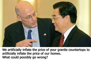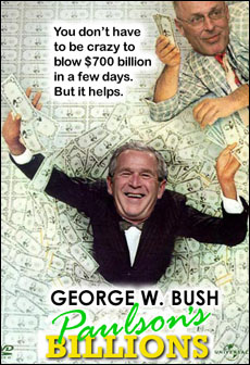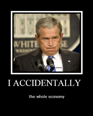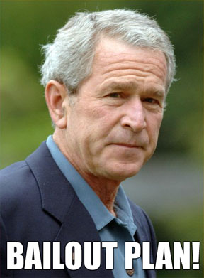 Unfortunately, Congressional Democrats and President Bush managed to find common ground for the first time in 8 years by agreeing that the best way to bail out Wall Street was to bail out (more like failout, amirite?) Wall Street to the tune of $5,000 for every single American taxpayer. This was made slightly funnier, due to the fact that Paulson (in charge of the bail-out being executed) deciding NOT to buy the toxic mortgages, meaning that thousands of poor jackasses who took out mortgages they couldn't afford so they could take their ten kids to Disneyland and buy a Dodge Proton, not realizing that they actually had to pay the money back are still buttfucked and will be sucking dick for motel room money soon.