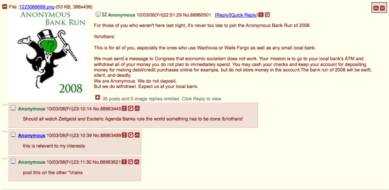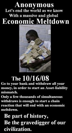 On Saturday October 2nd, a drunken /b/tard set forth a motion to /b/ that they PA the economy with a "run" (withdrawing all your Jew golds) on the banks. This was probably one of the stupidest ideas evar to grace the pages of /b/ since basement dwellers don't have any money much less bank accounts.
