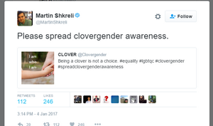 Clovergender is a troll made by some faggots on 4chan on the first of January, 2017. It was made to troll the SJW's by making a new gender called "Clovergender" (Cuz 4chan, clover, geddit?). This gender meant that you are a kid stuck in a man/woman body, and therefore like other children. It quickly became a complete clusterfuck and a lot of lulz were given.