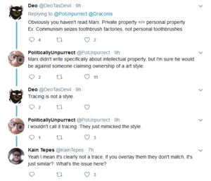 Deo is indisputably an individual with below average intelligence, which explains why she is quite the hypocritical type of communist. For instance, she proclaims to be thoroughly against private property, yet she resorted to file a DMCA claim because someone traced her Twitter profile picture and started a meme. In other words, when her twitter's profile icon was traced she completely lost her mind and demanded the perpetrator to stop. As a matter of fact, she even went on explaining how trolls and furfaggots from the alt-right had no permission from her to use her intellectual property, and intellectual properties such as copyrights are in fact private property. As a result, she committed what communists oppose the most, resorting to the utilization of the American capitalist laws protecting private property rights: filing a DMCA claim. How Ironic! Even more so hilarious is the fact that she now opposes Fair Use due to the fact that her fursona's face has become a viral internet meme just to trigger the fuck out of her.