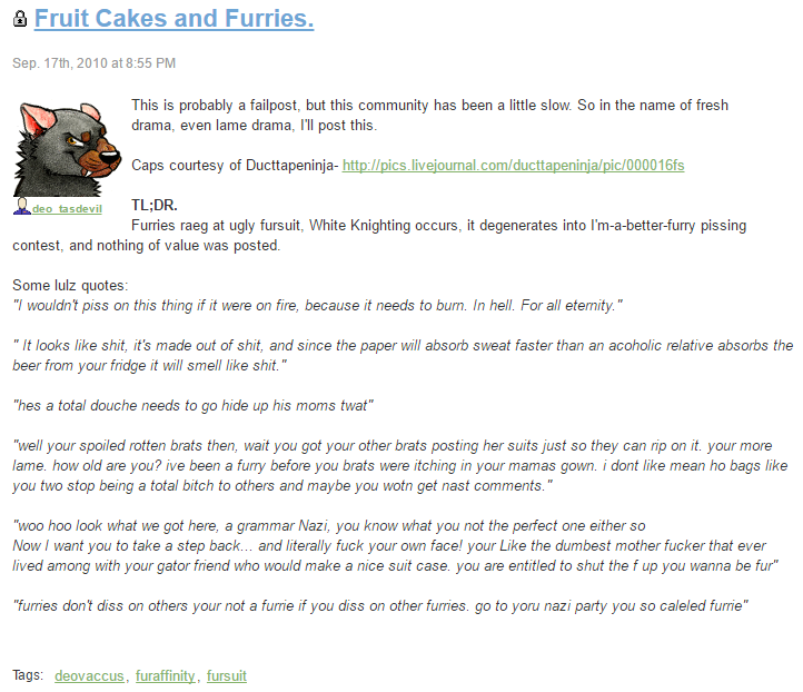 DeoTasDevil is part of a series on Visit the Furfaggotry Portal for complete coverage. |