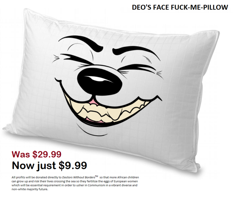 Deo figured out a secret formula how to defeat Capitalism. First step, be guilty and hypocritical: use capitalism to gain capital from providing art related services to other furries. All the profit generated from this procedure must be sent directly to Doctors Without Borders. Consequently, with the massive influx of non-European migrants flooding to Europe, this event will make it easier for communists like Deo to usher in Communism in a future where she as a white person is the minority as well as becoming vulnerable to rape; to be more politically correct: she will be vulnerable to cultural enrichment by a gang of Pisslamists. Allah Akbar, Diversity is our greatest strength. You can help Deo achieve this goal by purchasing one of these fuck-me-pillows with Deo's fursona face on it. All profits will be donated to Doctors Without Borders. Help Merkel Deo get raped Culturally Enriched by the very people that Doctors Without Borders want to save. Give her your shekels now and enjoy your purchase.