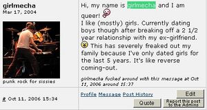Ironically, or even hilariously, Girlmecha turned out to be a fake lesbian herself. On October 11th, 2006, Girlmecha posted the following on the Something Awful forums, "I like (mostly) girls. Currently dating boys though after breaking off a 2 1/2 year relationship with my ex-girlfriend. This has severely freaked out my family because I've only dated girls for the last 5 years. It's like reverse coming-out." So is she a "real" bisexual or a "fake" one? Who knows! Regardless, she is apparently just as eager to comprehensively inform the internet about her new, true self as she was about herself as a "lesbian."
