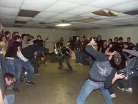 Not to be confused with children suffering from mental retardation, epileptics, or anyone else suffering from violent illness, hardcore dancing is also known as "slam dancing". Invented last Thursday by emo children and scenesters as a vegan alternative to moshing. Comparable to parlor karate in many ways, the original aim was to create a form of dance that was more extreme than mosh, but ended up being just like those who created it: shallow, trendy, and unnaturally idiotic in appearance.