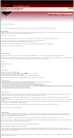 The entire thread is made with equal amounts of win from the EDiots and several deviantards, and fail from InSaNe. He kept contradicting himself, shouting out he's not gay or a "dog fucker". Eventually, he made one journal entry (now baleeted) where he stated he was OMG! Going to be the most famous artist EVAH! Oh, and he is not a furfag.