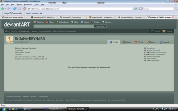 insane-reynard BANNED! Back online, proof that Deviantart's staff is full of fucktards.BANNED AGAIN LOLHe's not banned, he's taking a vacation. LOL