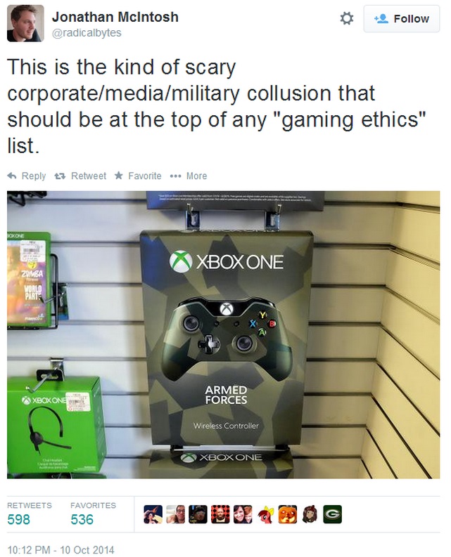 After this fiasco, Mac started to show everyone just how fucking crazy he really is with his continual flow of psycho tweets. Tweets implying things like: School shootings are caused by gamers, video games are bad because "fun" is a tool used by the patriarchy and, a camo colored Xbox controller he found in a store is proof that gaming is controlled by the military-industrial complex.
