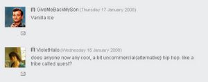 The Audioscrobbler forums consist principally of groupies promoting their friends' local bands, hipsters bickering about musical talent, or other mind numbing space wasting threads that only belong on either trollspring, failbook, shitter, MySpastic, or some self obsessed whiney neurotic fucks blog.