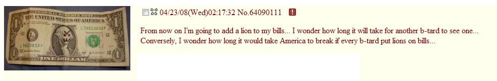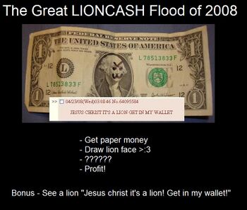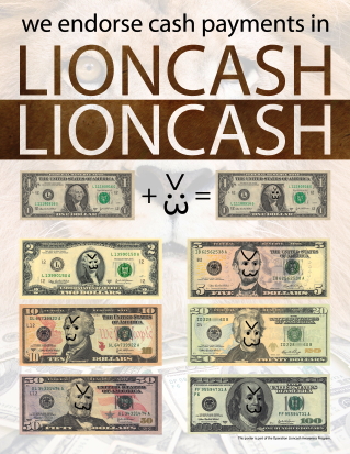 Operation LIONCASH (also called The Great LIONCASH Flood of 2008) was initiated Last Thursday, the stated goal being for each participant to print lions on as many of his or her dollar bills as possible, until all money is converted to lion money, thus uniting the world by breaking down financial barriers with a single currency!