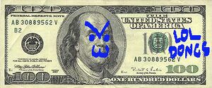 In other words, it is perfectly legal to write or draw anything you like on U.S. currency — even LOL DONGS or FUCK YOU GEORGE W. BUSH — so long as you're not trying to render the bill useless as currency.>:3