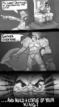 As if creating videos based on served Machinima tools and in game cinematics wasn't enough, anyone with basic reading skills can find out that Smith likes to borrow ideas from other, more or less talented creators. In one of his better known videos called "The Day of the Cataclysm", a leader of one of WoW factions commands his soldiers to build him a statue. This little gag was widely believed to be Smith's original idea for almost two years, until one of his fans FINALLY did some research and pointed out that this is actually based on a short comic, made years ago for some Blizzard Comic Contest. The plagiarist and his other fans dismissed the accusation, stating that it is only a small portion of the video, but that's hardly an excuse since the rest of this skit was unfunny load of shit. Nevertheless, this little incident made him finally put the link to the comic in video and it's description in a desperate way to save his fat face.