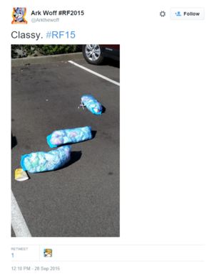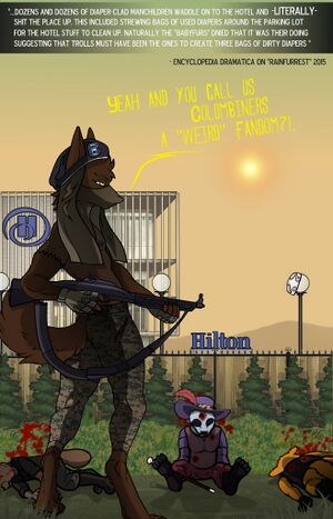 Since Rainfurrest was held in Seattle, part of the Pacific Northwest which is known to be the Babyfur capitol of the world, dozens and dozens of diaper-clad manchildren would waddle on down to the hotel year after year and literally shit the place up. This included strewing bags of used diapers around the parking lot for the hotel staff to clean up. Naturally, the babyfurs deny that this was their doing, suggesting that trolls must have been the ones to create three bags worth of dirty diapers. Yeah, right.