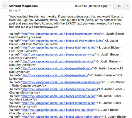 On 25th December 2013, Google✡ owned RapGenius.com by punishing them for ugly and blackhat SEO. The mastermind Mahbod Moghadam who does nothing than harm to the site decides he wanted to train his Jewish skill to level 99, and started to offer Twitter shoutouts on the official Rap Genius twitter in exchange for blog links which is one of the oldest SEO tricks in the book. RapGenius.com thought that their Jewish connection to Google would help them, but the search giant showed no mercy and punished their shitty Ruby coded site and unleashed the wrath of a thousand angry Nazi's. They went on to cry like this was another shoah and got removed from the blacklist after a few days.