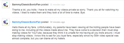 A few weeks later, he was already back on Youtube and uploaded a generic Sonic 2 video, but he deleted it 2 days later because dem fricking trolls already found him.