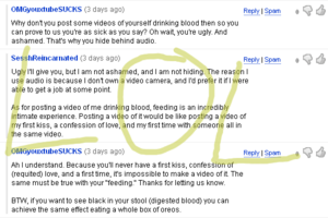 SesshReincarnated originally got butthurt by the comments on this video and decided to speak out against the horrible trolls and flamers from ED. This just increased the trolling on the video and lulz were had by all. SesshReincarnated also tried to argue that the reason we've never seen a vampire feeding before is because it's such an intimate experience. She compared it to a variety of things that she'll never experience, such as:
