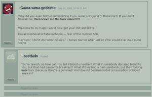 SesshReincarnated is a gay, ugly, virgin, weaboo, Jewish, Vampire (Holy FUCK that's a lot of adjectives) on YouTube who thinks any opinion contrary to her own is a flame. The fact is, most of the comments she responds to are flames, but that doesn't make her any less of a douchebag or a dumbass. Note: The flames are 100% accurate