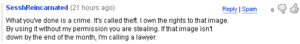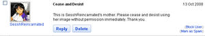 After seeing that another YouTube user took a picture she put on her public DeviantART gallery and made it their background image on YouTube, SesshReincarnated decided she had been wronged. Rather than do the smart thing and STFU, Sessh decided that it was time to get her mom Internet lawyer involved. This only added further proof that SesshReincarnated is a dumbfuck, since she fails to understand fundamental concepts of US copyright law such as the fair use clause.