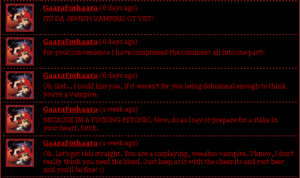 After trying to explain to everybody how vampires are totally real (by responding to comments of obvious trolls), SesshReincarnated eventually gave up and posted her own videos so she could delete the truth mean/rude comments. These videos consisted entirely of a static image with her talking (and sounding like a man), just resulting in more trolling and lulz.
