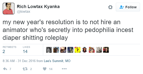 A few days before the turn of 2017, Kelly was revealed to be the very thing he accused Lowtax of being and much, much worse, complete with Sarah Butts style chatlogs of child grooming, according to several sources who have come forward with tales of Schmorky trying to gender play underage people as his personal sex fantasies, much to their discomfort and disgust.