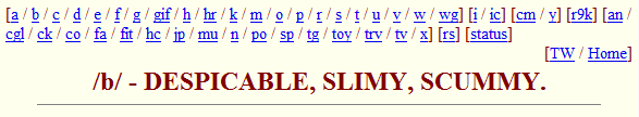 Currently /b/ is a writhing mass of trolls trolling trolls awaiting 4chan's demise and ROW ROW FIGHT THE POWAH remixes setting the mood for retarded threads about moot being v&, or ebaumsworld finding something worthy of an "October Surprise" in Palin's mail. The world by now realizes however, that /b/ has so very little to do with this, yet the fucking peanut gallery thinks that they are actually influencing the election. There are already plans being traded around for fagging up Palin rallies by spouting memes whilst Rickrolling dumbass Palintards.