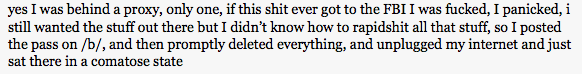 Earlier it was just some prank to me, I really wanted to get something incriminating which I was sure there would be, just like all of you anon out there that you think there was some missed opportunity of glory, well there WAS NOTHING, I read everything, every little blackberry confirmation… all the pictures, and there was nothing, and it finally set in, THIS internet was serious business, yes I was behind a proxy, only one, if this shit ever got to the FBI I was fucked, I panicked, i still wanted the stuff out there but I didn’t know how to rapidshit all that stuff, so I posted the pass on /b/, and then promptly deleted everything, and unplugged my internet and just sat there in a comatose state