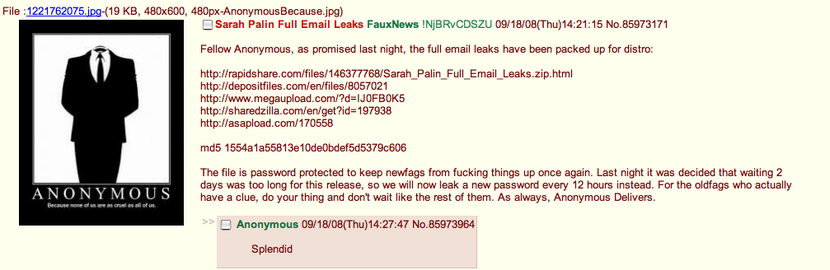 Anonymous started a thread after gaining access to Palin's email address using only information from Google and Wikipedia. After learning of Palin's known clandestine email address at [email protected], the perp decided to check also for [email protected] (but completely ignored Todd and Sarah's drop box [email protected] and didn't even fire up Skype to socially engineer them via homephone, (907) 373-3113).