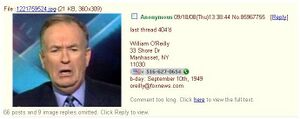 After the story being smeared all over the news for several hours, Bill O'Reilly was chomping at the bit, calling those hosting and trading the screen caps "DESPICABLE, SLIMY, SCUMMY" and an "EXTREMIST FAR LEFT INTERNET HATE GROUP" (Close, but no cigar!). Bill then told the nation that he was going to let the FBI know all about it so they could move forward with the investigation. Thanks Bill, don't know what we'd do without ya, pal. Bill's dox are now floating around the internet and many stephens are being pointed his way.