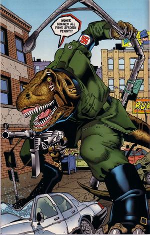 Tyrannosaurus Reich is a Nazi dinosaur from an super hero comic put out by DC Comics. He was introduced to planet Earth via a portal in order to scrub Jewish filth from the world, but was quickly driven back to his home planet by a cat who could change sizes when it was agitated. This boring plot twist would have been good if the dinosaur has actually succeeded in wiping out the filthy Jewish race but instead he failed to beat Hitler's high score and ended up failing miserably, resulting in his appearing in only one issue.