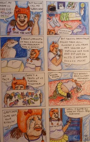 This, along with the absence of any conclusive evidence that he ever wore an animal skin at any time is what would disqualify him from being labelled as "furfag" strictly speaking. However, his fixation and personal identification with wolves were sufficiently pronounced and demonstrated to earn his classification as wolfaboo that, along with his aspie-like infatuation with his own ideas no matter how generally insane, wrong or disgusting are of greatest significance and will be the topic of further discussion.