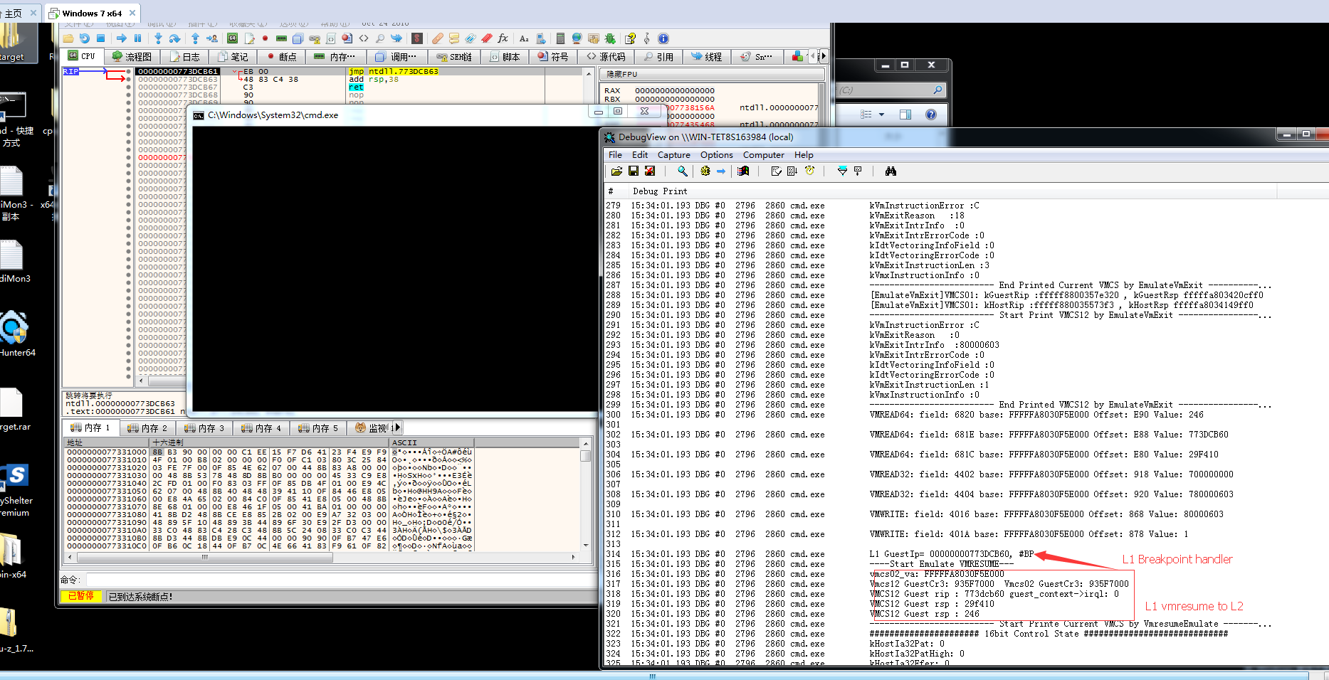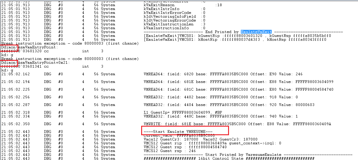 2. We can see the windbg as following result, after the DdiMon execute a breakpoint, kHypervisor will first capture the breakpoint :