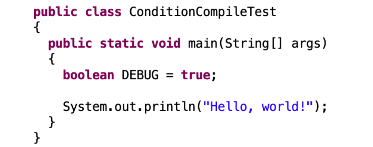 所以,Java 语法的条件编译,是通过判断条件为常量的 if 语句实现的,编译器不会为我们编译分支为 false 的代码。