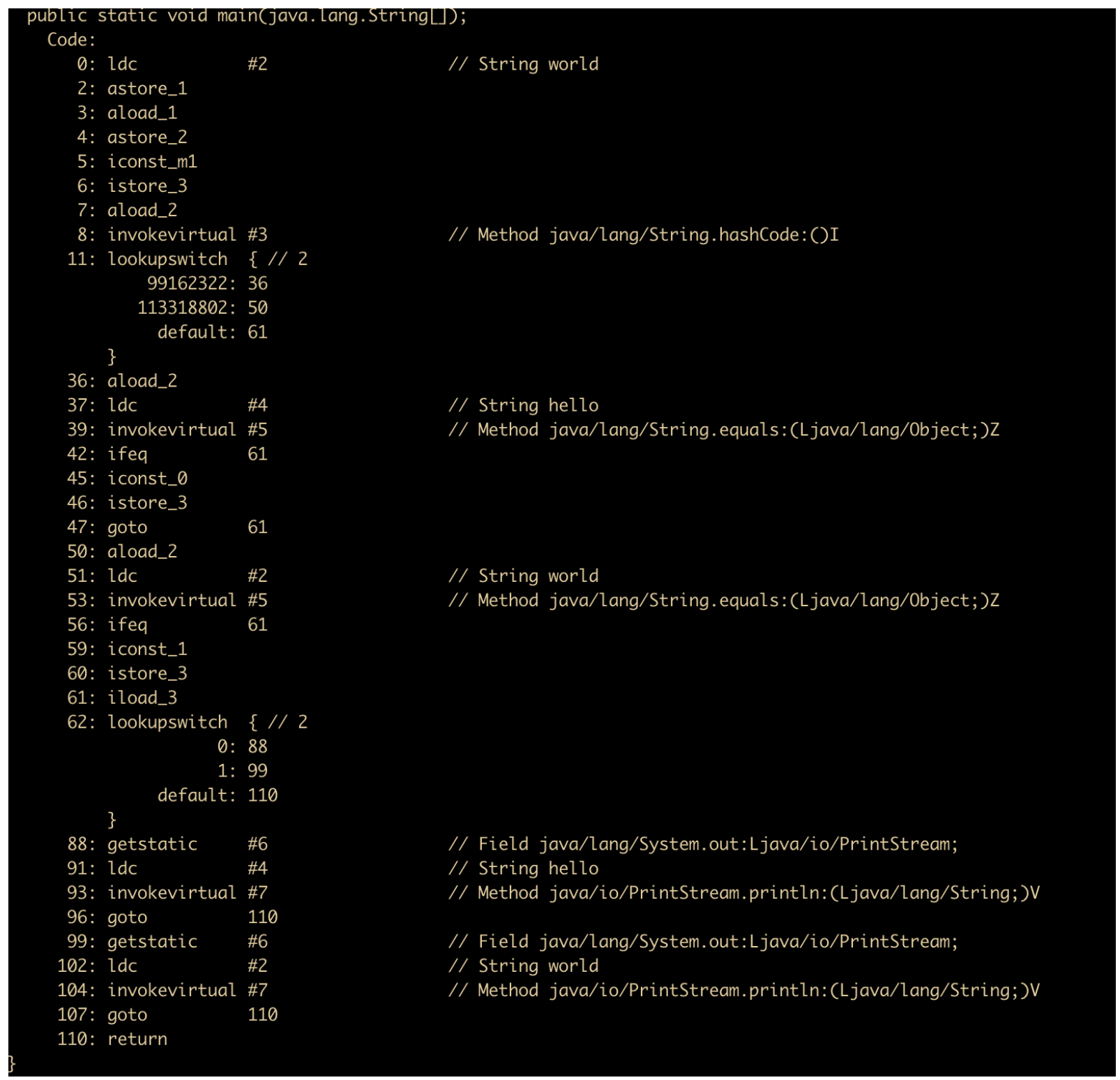 根据字节码可以看到,进行 switch 的实际是 hashcode 进行判断,然后通过使用 equals 方法进行比较,因为字符串有可能会产生哈希冲突的现象。