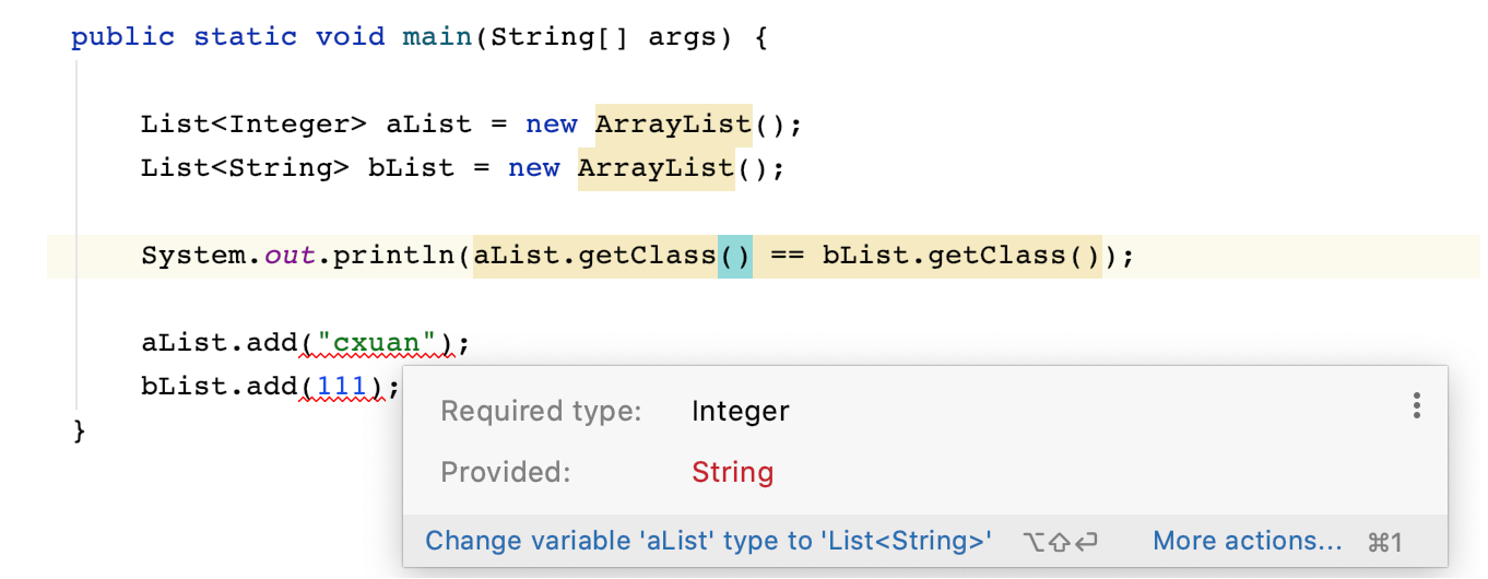 System.out.println(aList.getClass() == bList.getClass());List<Ineger> 和 List<String> 被认为是不同的类型,但是输出却得到了相同的结果,这是因为,泛型信息只存在于代码编译阶段,在进入 JVM 之前,与泛型相关的信息会被擦除掉,专业术语叫做类型擦除。但是,如果将一个 Integer 类型的数据放入到 List<String> 中或者将一个 String 类型的数据放在 List<Ineger> 中是不允许的。