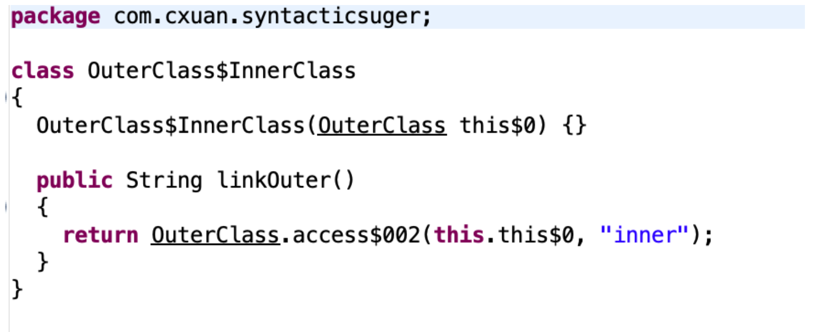 内部类其实也是一个语法糖,因为其只是一个编译时的概念,一旦编译完成,编译器就会为内部类生成一个单独的class 文件,名为 outer$innter.class。